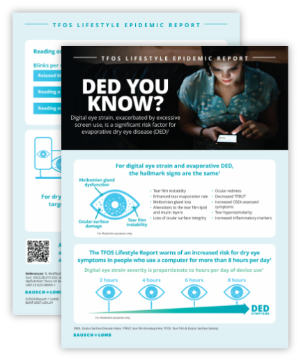 References: 1. Sheppard JD, Nichols KK. Dry eye disease associated with meibomian gland dysfunction: focus on tear film characteristics and the therapeutic landscape. Ophthalmol Ther. 2023;12(3):1397-1418. doi:10.1007/s40123-023-00669-1 2. Craig JP, Nelson JD, Azar DT, et al. TFOS DEWS II report executive summary. Ocul Surf. 2017;15(4):802-812. doi:10.1016/j.jtos.2017.08.003 3. Lemp MA, Crews LA, Bron AJ, Foulks GN, Sullivan BD. Distribution of aqueous-deficient and evaporative dry eye in a clinic-based patient cohort: a retrospective study. Cornea. 2012;31(5):472-478. doi:10.1097/ICO.0b013e318225415a 4. Rabensteiner DF, Aminfar H, Boldin I, et al. The prevalence of meibomian gland dysfunction, tear film and ocular surface parameters in an Austrian dry eye clinic population. Acta Ophthalmol. 2018;96:e707-e711. doi:10.1111/aos.13732 5. Badian RA, Utheim TP, Chen X, et al. Meibomian gland dysfunction is highly prevalent among first-time visitors at a Norwegian dry eye specialist clinic. Sci Rep. 2021;11(23412):1-8. doi:10.1038/s41598-021-02738-6 6. Bausch + Lomb 2025 State of Dry Eye Survey. 7. Al-Mohtaseb Z, Schachter S, Shen Lee B, Garlich J, Trattler W. The relationship between dry eye disease and digital screen use. Clin Ophthalmol. 2021;15:3811-3820. doi:10.2147/OPTH.S321591 8. Bron AJ, de Paiva CS, Chauhan SK, et al. TFOS DEWS II pathophysiology report. Ocul Surf. 2017;15(3):438-510. doi:10.1016/j.jtos.2017.05.011 9. Yeotikar NS, Zhu H, Markoulli M, Nichols KK, Naduvilath T, Papas EB. Functional and morphologic changes of meibomian glands in an asymptomatic adult population. Invest Ophthalmol Vis Sci. 2016;57(10):3996-4007. doi:10.1167/iovs.15-18467 10. Zhang R, Pandzic E, Park M, Wakefield D, Di Girolamo N. Inducing dry eye disease using a custom engineered desiccation system: impact on the ocular surface including keratin-14-positive limbal epithelial stem cells. Ocul Surf. 2021;21:145-159. doi:10.1016/j.jtos.2021.04.006 11. Modern technology and a multi-screen lifestyle viewed as Important factors in rising prevalence of dry eye disease. PR Newswire. Published October 17, 2016. Accessed September 8, 2025. https://www.prnewswire.com/news-releases/modern-technology-and-a-multi-screen-lifestyle-viewed-as-important-factors-in-rising-prevalence-of-dry-eye-disease-597289311.html 12. Amescua G, Ahmad S, Cheung AY, et al; American Academy of Ophthalmology Preferred Practice Pattern Cornea/External Disease Panel. Dry Eye Syndrome Preferred Practice Pattern®. Ophthalmology. 2024;131(4):PP1-P49. doi:10.1016/j.ophtha.2023.12.041 13. Cequa. Prescribing Information. Sun Pharmaceutical Industries, Inc. 14. Eysuvis. Prescribing Information. Alcon Laboratories, Inc. 15. Restasis. Prescribing Information. AbbVie Inc. 16. Tyrvaya. Prescribing Information. Oyster Point Pharma, Inc. 17. Vevye. Prescribing Information. Harrow Eye, LLC. 18. Tryptyr. Prescribing Information. Alcon Laboratories, Inc. 19. MIEBO. Prescribing Information. Bausch & Lomb, Inc.