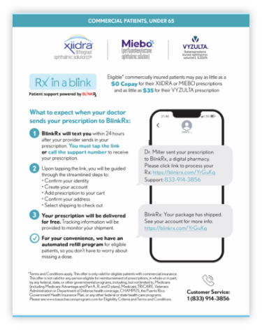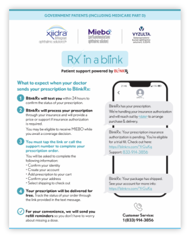 These resources inform patients about BlinkRx and what to expect when you send your patient prescriptions through this program. There are 2 versions: one for commercial patients under 65 and one for government patients (including those covered by Medicare Part D).